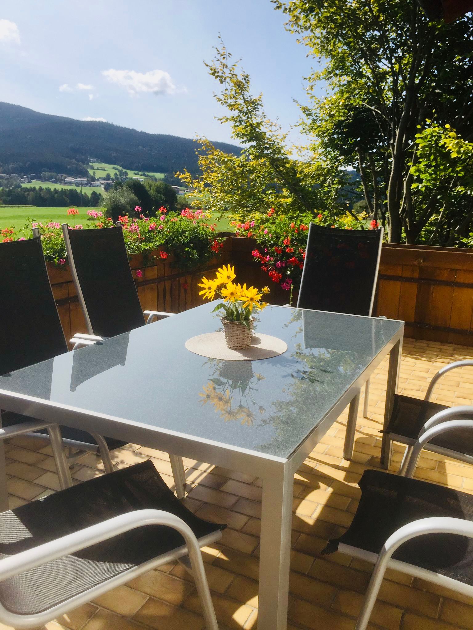 Loggia und Freisitz mit Süd-West-Ausrichtung ermöglichen es Ihnen, bei schönem Wetter zu jeder Tageszeit die Sonne und den herrlichen Ausblick zu genießen. Ausreichende Sitzmöglichkeiten (und auch ein Sonnenschirm) sind vorhanden.