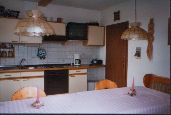 Unsere Wohnung ist "komplett" ausgestattet. Sie finden z. B. in der Einbauküche (Kühlschrank, Spülmaschine, Spüle, 4-Zonen-Ceranfeld mit Backofen, Dunstabzug) alle notwendigen Gegenstände und Geräte, um auch für die größere Familie die Mahlzeiten zu bereiten. So sind nicht nur ausreichende Mengen an Geschirr, Besteck und Töpfen vorhanden, sondern auch z. B. Kaffeemaschine, Brotschneidemaschine, Handmixer, Toaster, Wasserkocher.