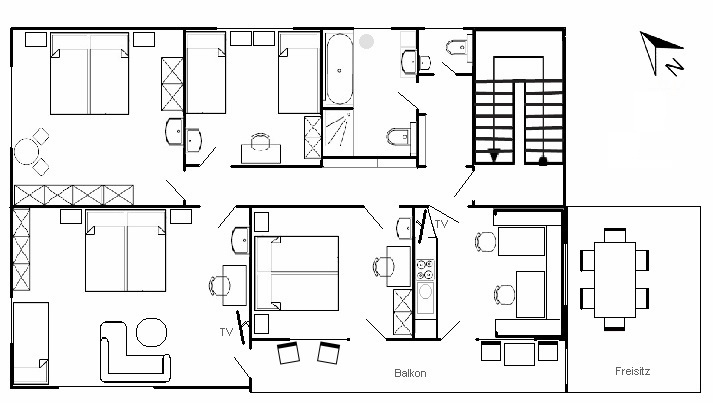 Die Handskizze zeigt die derzeitige Aufteilung und Einrichtung. Da wir aber bemüht sind, unser Angebot für Sie ständig zu verbessern, kann sich an der Einrichtung natürlich jederzeit etwas ändern.