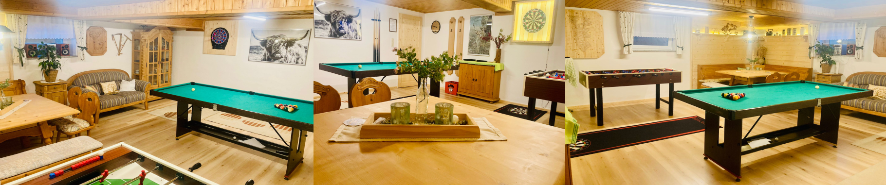 Ihre Möglichkeiten bei uns beschränken sich nicht nur auf die Ferienwohnung. Im Keller bieten wir Ihnen zusätzlich einen großen Raum, in dem sich u. a. Fitnessgeräte, ein kleiner Billardtisch, ein Kicker und eine Dartscheibe befinden. Eine Tischtennisplatte und ein Trampolin stehen im Außenbereich ebenso zur Verfügung, wie unser kleiner Spielplatz.